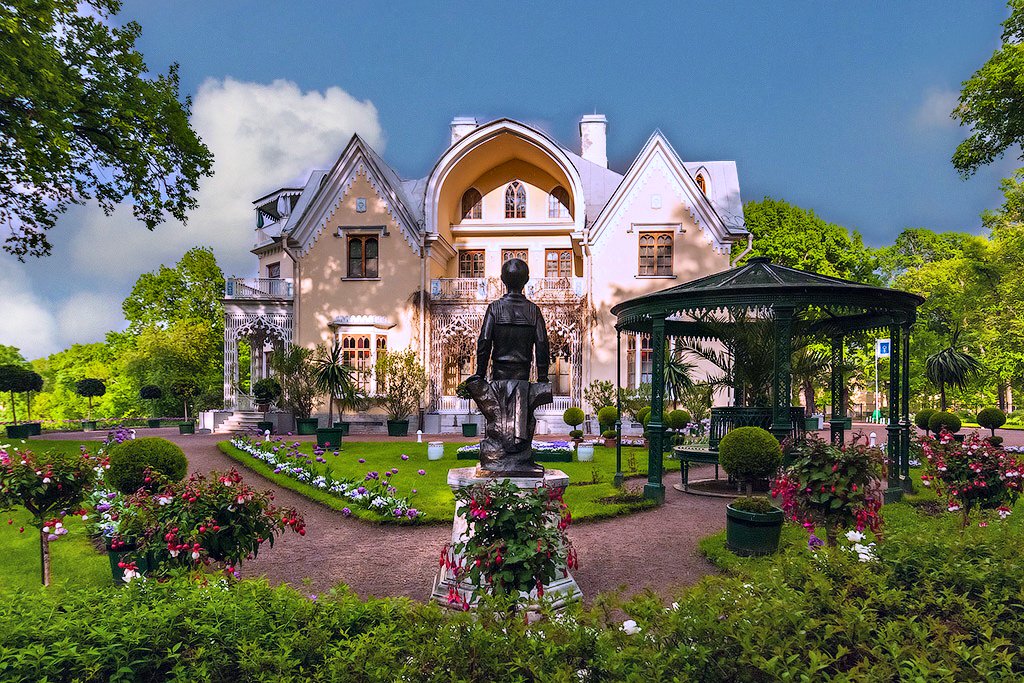 Дворец Коттедж в романтическом-готическом стиле — основное здание паркового александрийского архитектурного ансамбля.